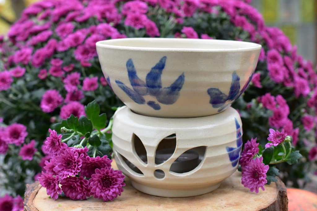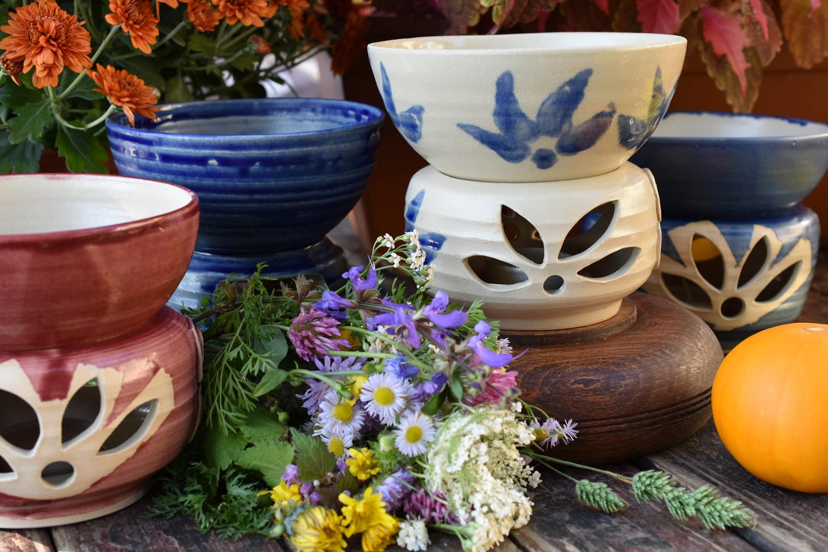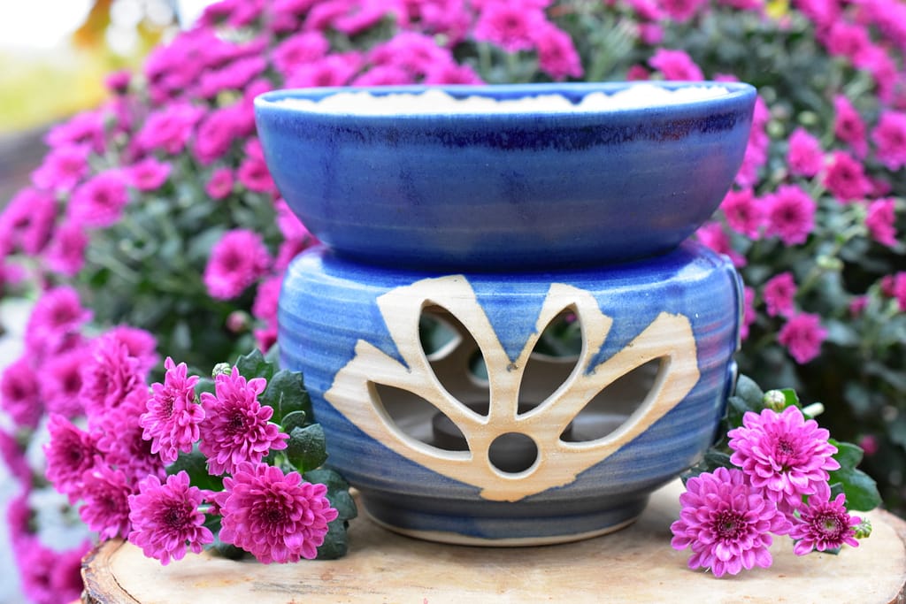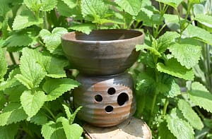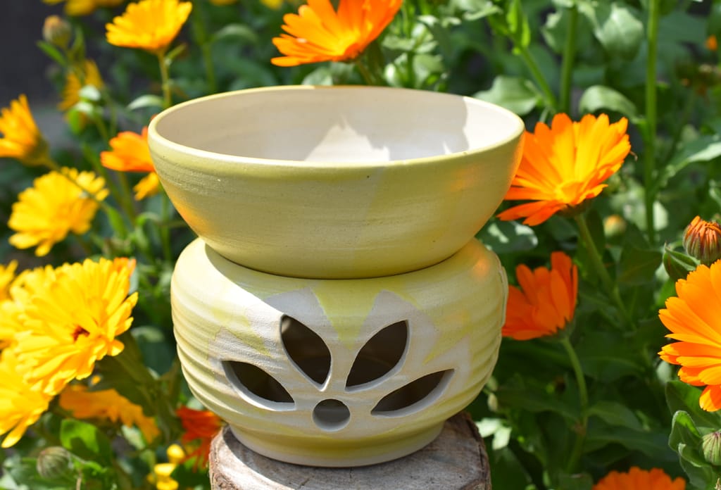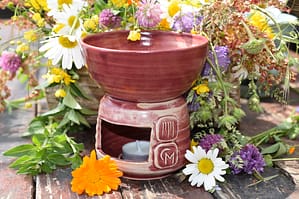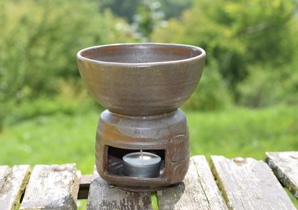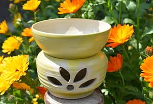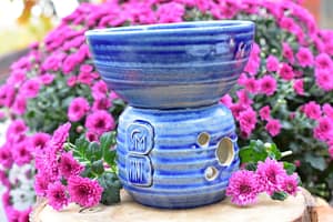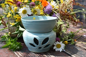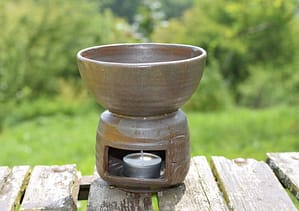 Sie wurden von Hand auf der Töpferscheibe gedreht und mit ökologischen mineralischen Farbstoffen, Holzaschen und Lavagestein glasiert und bei 1230° wasserdicht und feuerfest gebrannt. Somit sind unsere Aromalampen ganz natürliche, ohne giftigen Chemikalien gemachte Einzelanfertigungen.